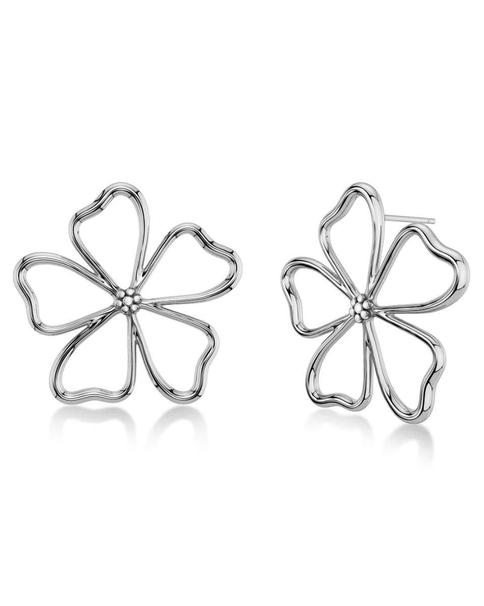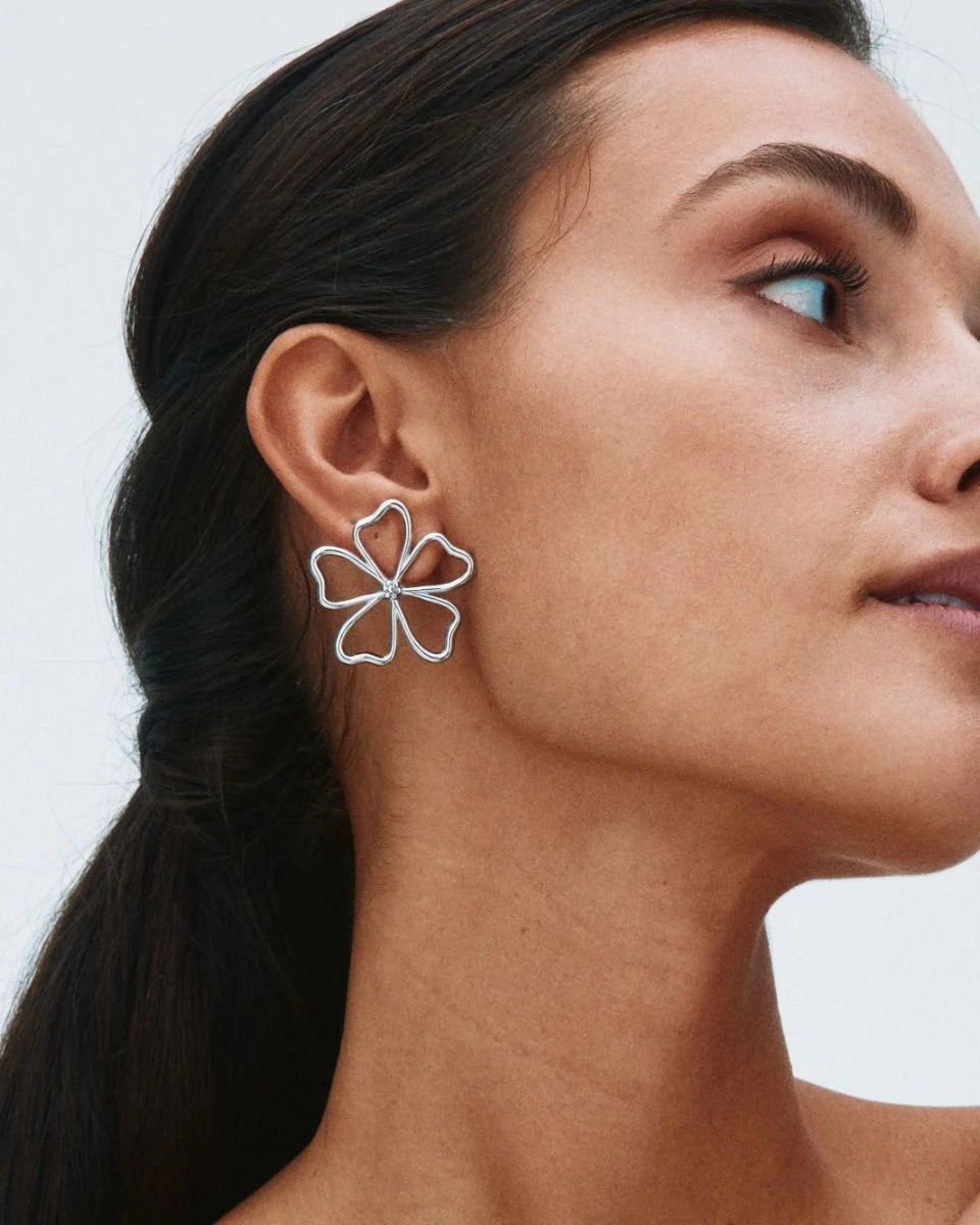 De stiliserade blomstren i lekfulla Alba andas sommarsol mot fräknig hy. De större studsen i blankt rostfritt stål blir ett lekfullt statement och är fina att matcha med den överdimensionerade ringen i samma serie.