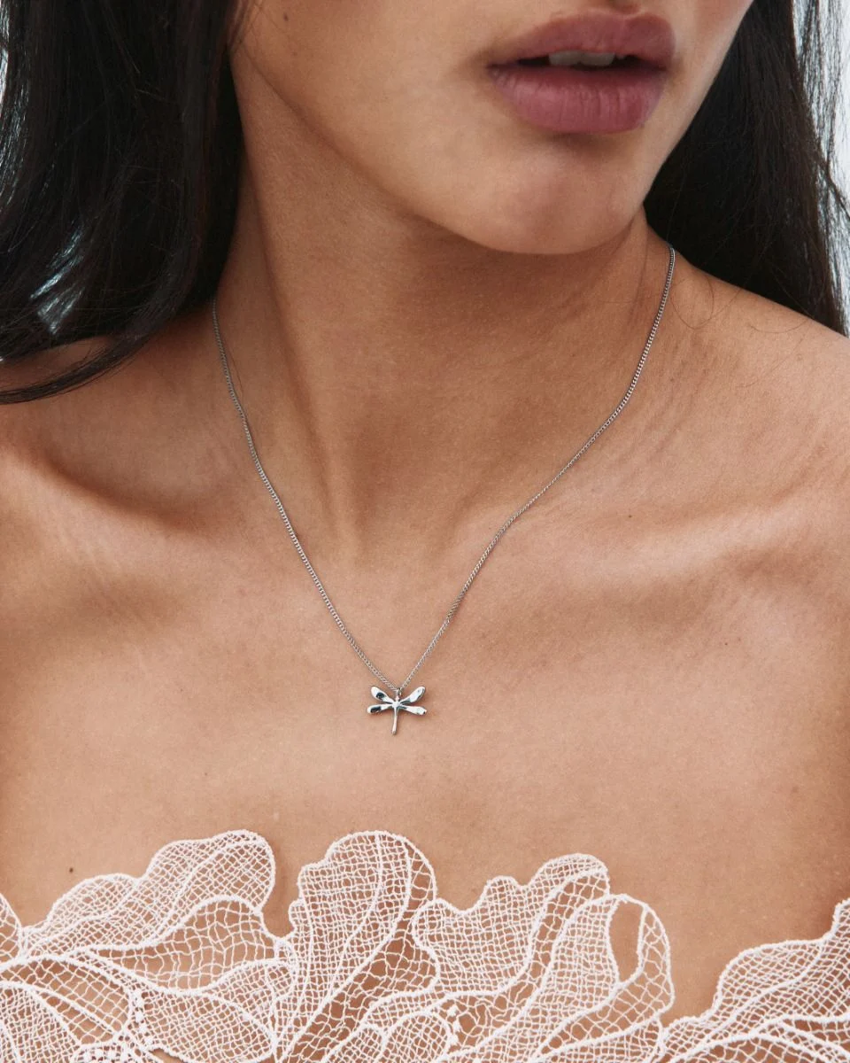 En drömsk, stiliserad trollslända med utsträckta vingar spelar huvudrollen i serien Dragonfly. Det mindre halsbandet i blankt rostfritt stål har sländan som en berlock. Fint att bära i lager med andra favorithalsband, och varför inte matcha det med seriens nättare ring?