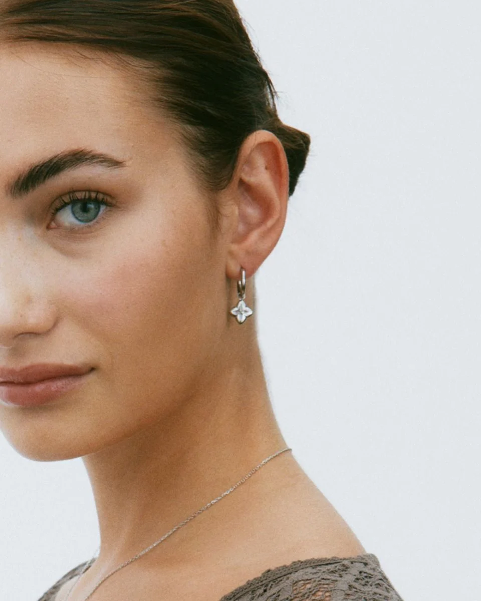 Scala bjuder på en stiliserad blomform i en tidlös design inspirerad av klassiskt kakel med fasetter som fångar ljuset. De mindre hoopsen, här i blankt rostfritt stål, glänser vackert i öronen. Hängena är avtagbara, för att skapa två örhängen i ett.