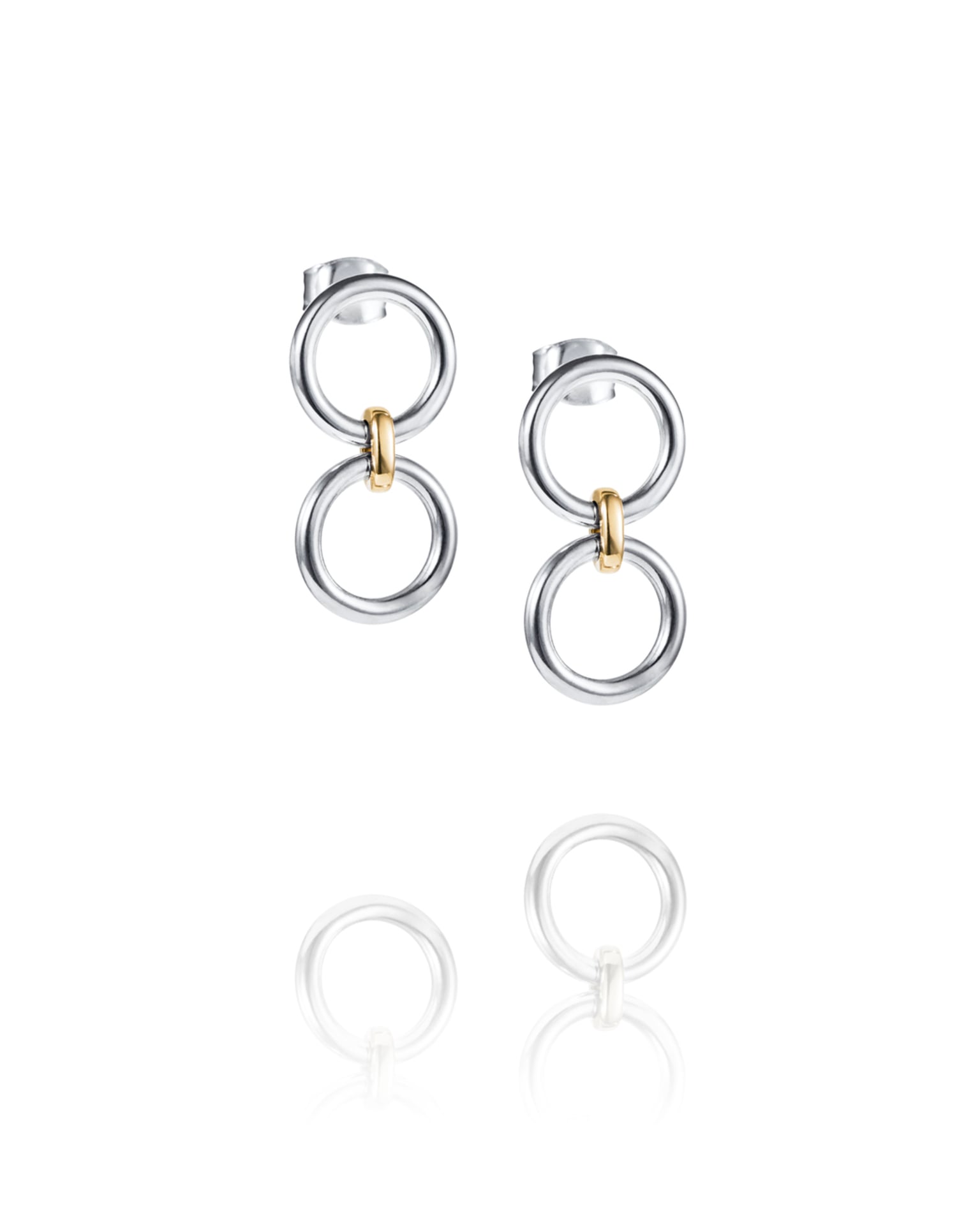 Örhänge med två tunna ringar i återvunnet sterlingsilver som är sammanlänkade av en liten ring i 18k guld.