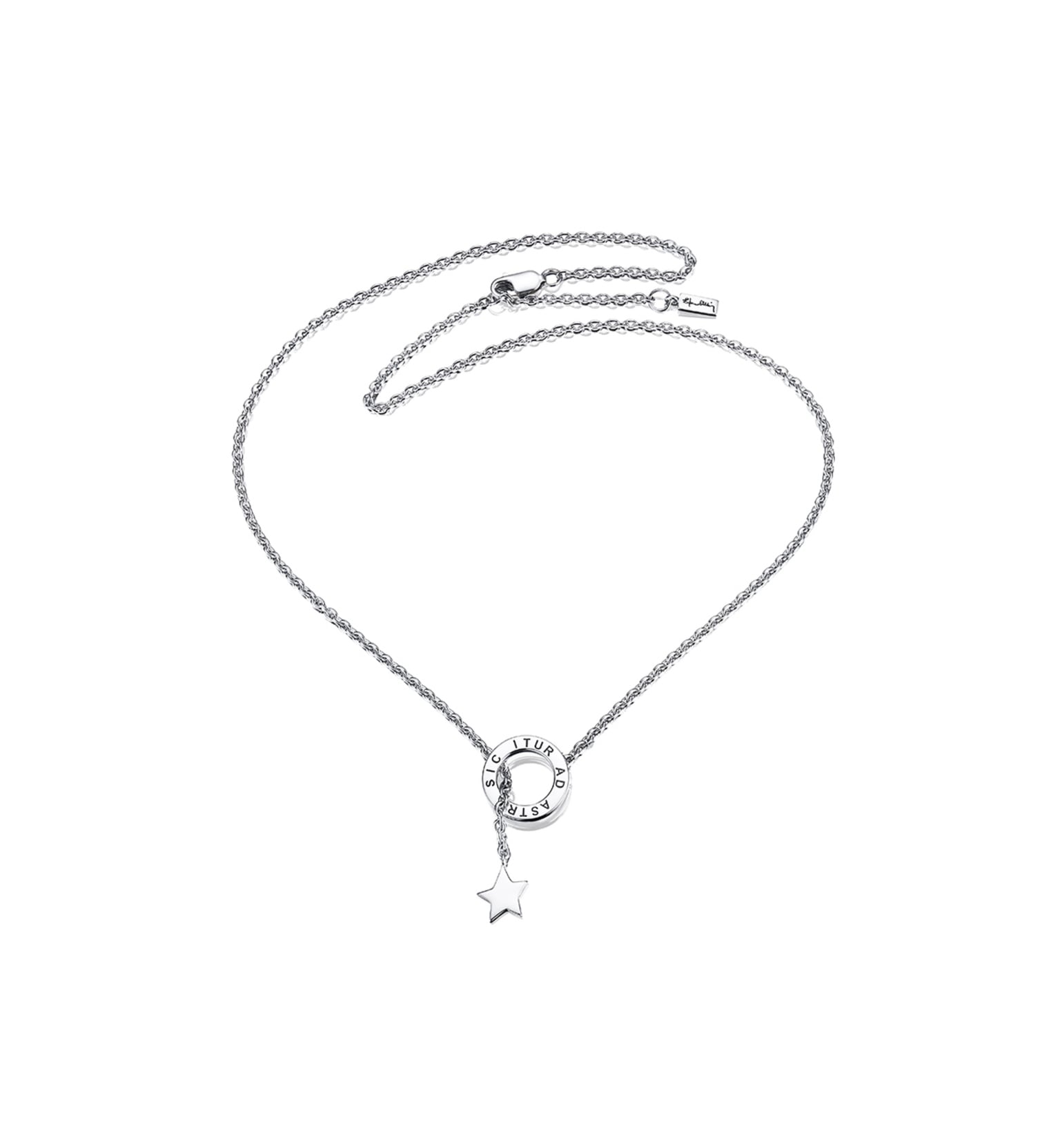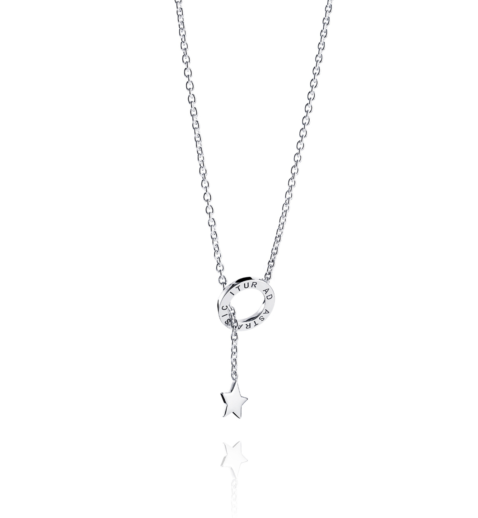 Halsband i återvunnet sterlingsilver med en ring stansad med Sic itur ad astra – vägen till stjärnorna på latin. Stjärna på kedja som löper genom ringen.