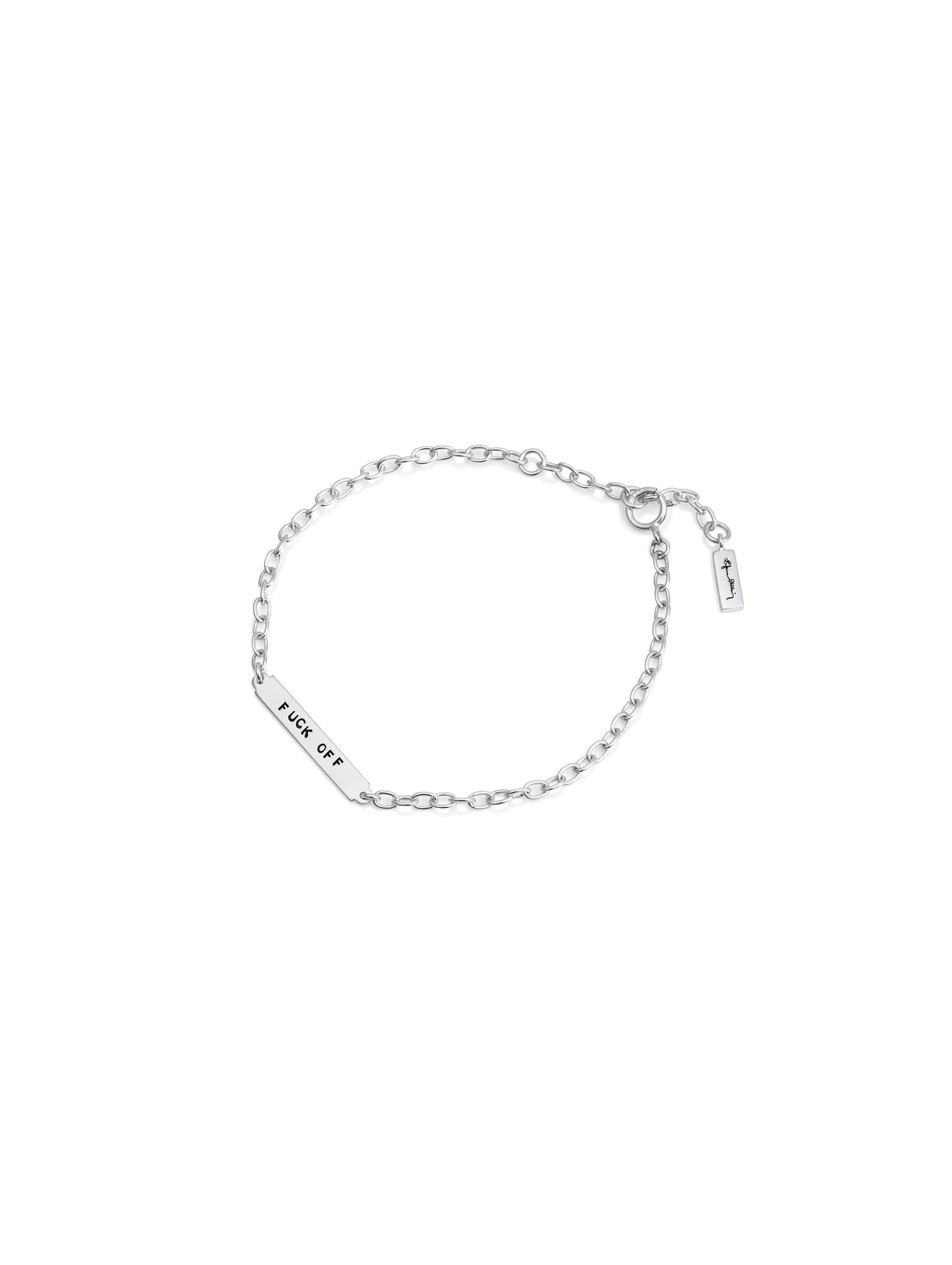 Armband i återvunnet sterlingsilver med en silverplatta stansat med texten ”Fuck Off”.