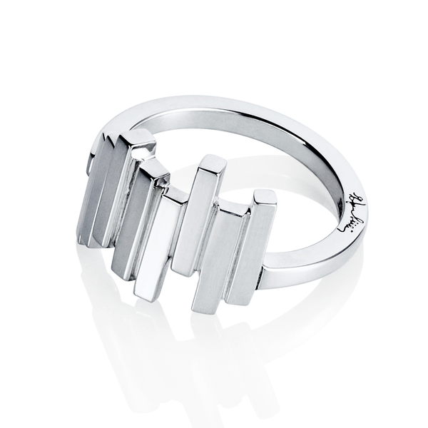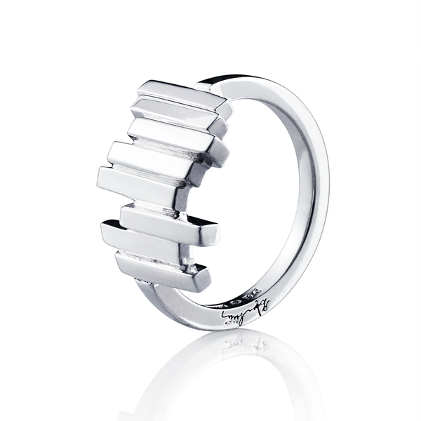 Ring i återvunnet sterlingsilver formad som trappsteg där ljuset reflekteras i metallen.