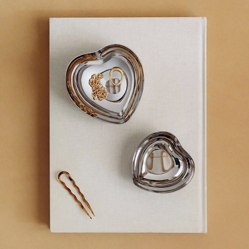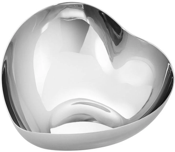 Den här hjärtformade skålen är en vacker symbol för kärlek. Skålens eleganta form i rostfritt stål gör den till ett mångsidigt designföremål på skrivbordet eller sminkbordet. Den är perfekt för förvaring av smycken och småsaker eller för servering av nötter, godis eller annat tilltugg. Designen finns i två storlekar, och den mindre skålen ryms perfekt i den större.