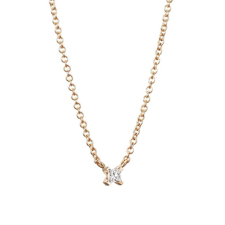 Klassiskt halsband i 18k rödguld med en prinsesslipad diamant.