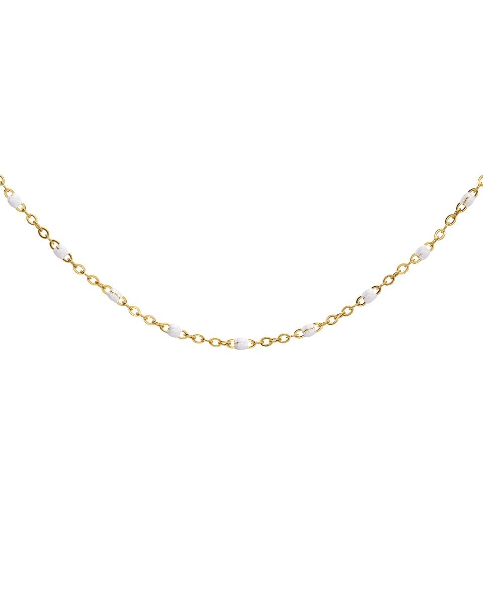 Nätta Perlina bjuder på rader av små, små färgade emaljpärlor för en fräsch sommarlook. En given sommarsuccé i lager på lager mot solbrännan. Serien kommer endast i 14K guldplätering, här i ett halsband med vita pärlor på en tunn kedja. Kombinera gärna med det matchande armbandet.