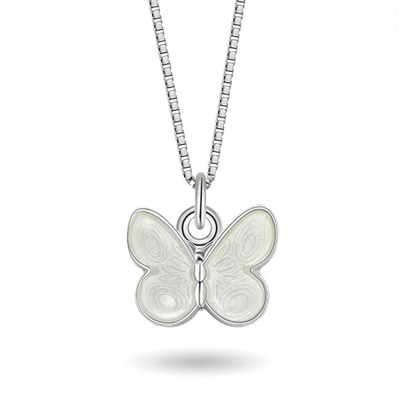 “Titta! En blomma med vingar!” Detta klassiska fjärilshänge känner många igen från sin egen barndom. Fjärilarna finns i flera färger; precis som riktiga fjärilar. Smycket är i sterlingsilver och belagt med rosa emalj.