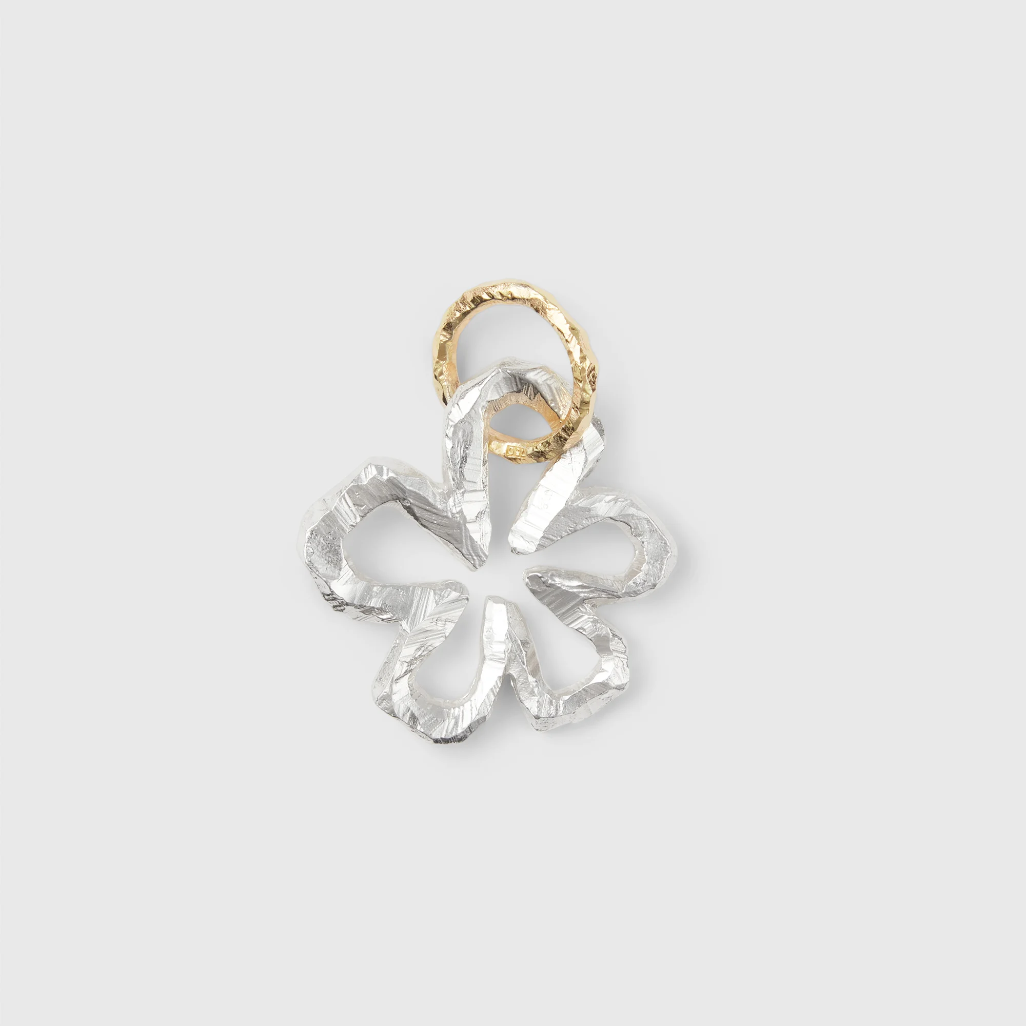 En av våra klassiker, Ringo Blomma här i silver med guldögla. Stämplad med en sköldpadda, symbolen för ett långt och lyckligt liv.