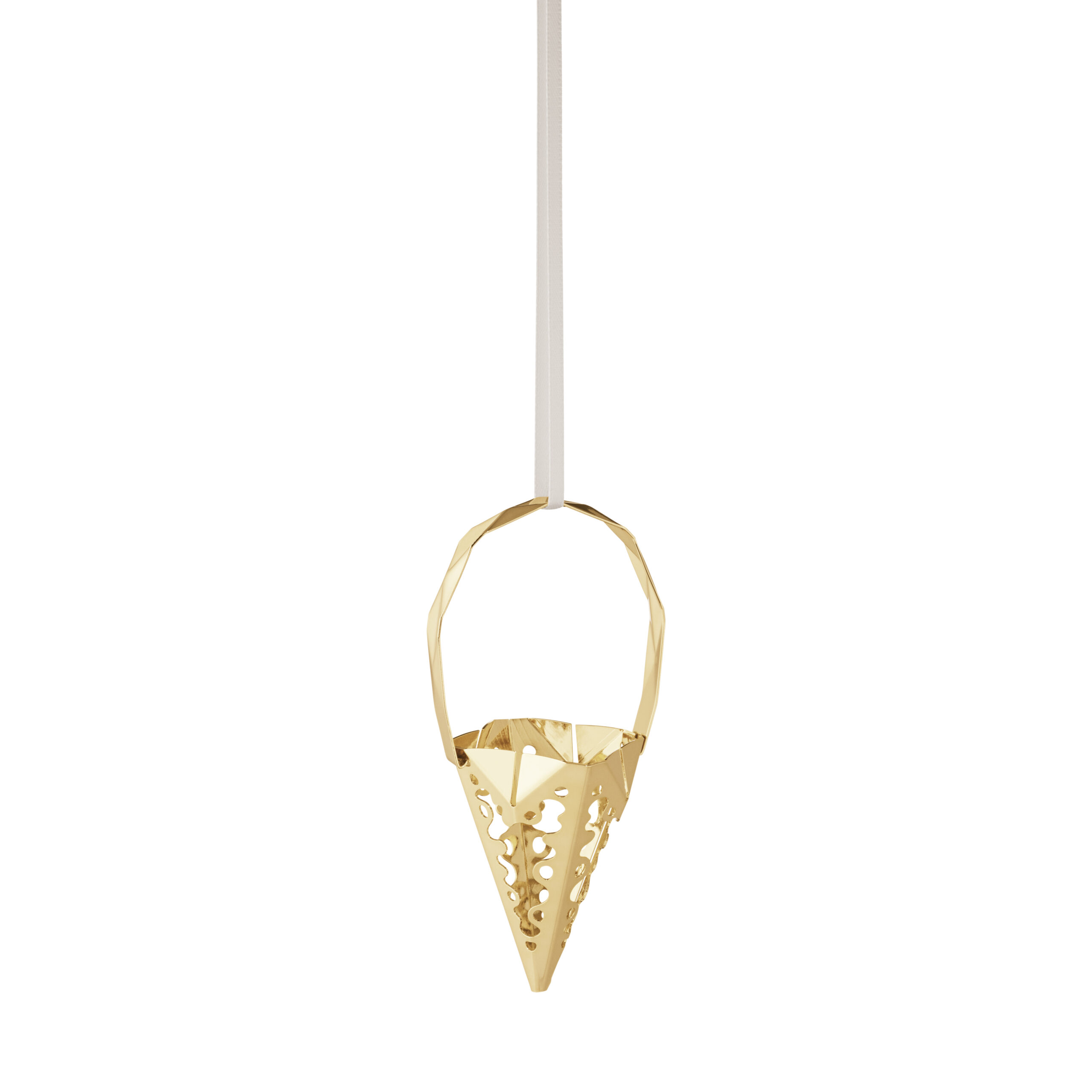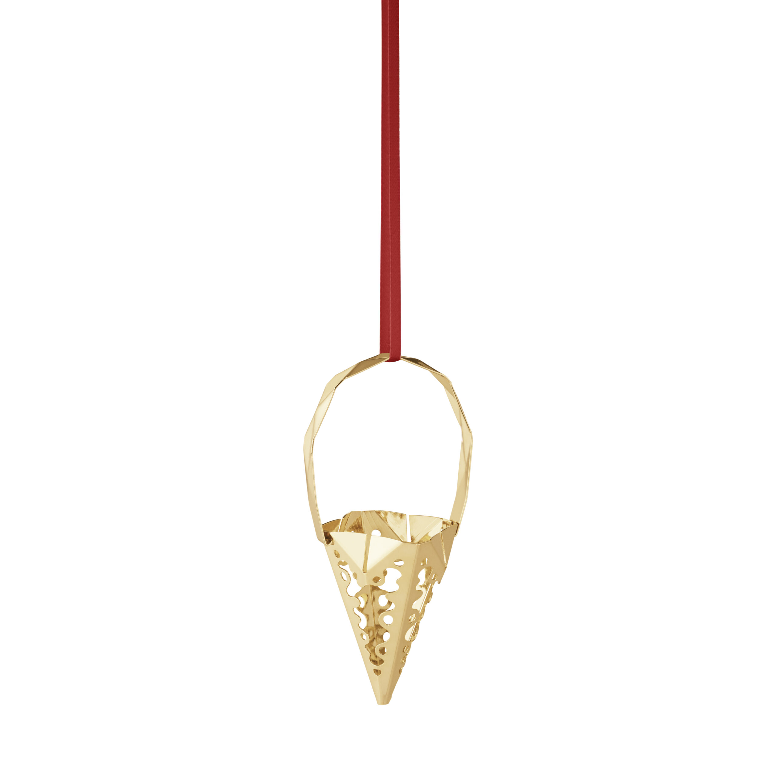 Den här konformade julprydnaden är pläterad med 18 karat guld och ger ditt hem ett varmt sken. Guldkonen är utsmyckad med spetsinspirerat mönster och pryds av årets band i benvitt samt det klassiska röda bandet. Dekorationen designades av Sanne Lund Traberg som en del av 2022 års julkollektion.