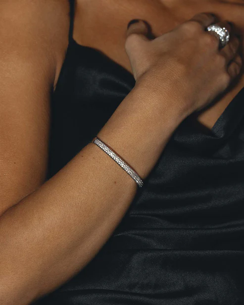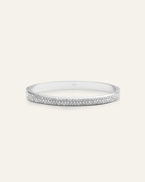 Margit Bracelet är ett armband i bangle-modell, dekorerat med små vita stenar som täcker hela ytan. En stilren design som kan bäras ensam eller kombineras med andra armband.