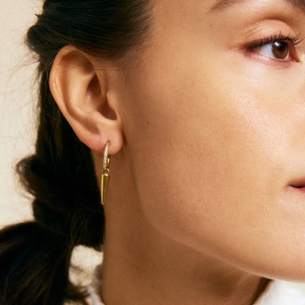 I Peak hoops sparkle har vi satt klara små stenar på framsidan av ringen som håller den långsmala niten, coolt och effektfullt örhänge. I Peak hoops sparkle kan man ta av niten och bara använda hoopsen som de är, eller hänga på något mer om man vill. Peak hoop ses här i blank 14K guldplätering. Kolla också in andra delar i serien Peak.