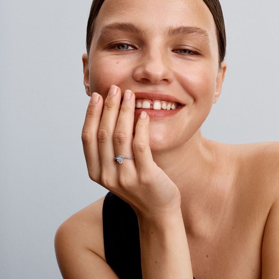 Ett vågigt band kombineras med en hjärtformad sten i denna unika ringdesign. Den är tillverkad i sterlingsilver och pryds av en kloinfattad hjärtslipad kubisk zirkonia som kontrasterar mot ett glittrande pavéband. Ett modernt smycke med en elegant, böljande design som passar perfekt ihop med dina favoritsmycken i sterlingsilver.