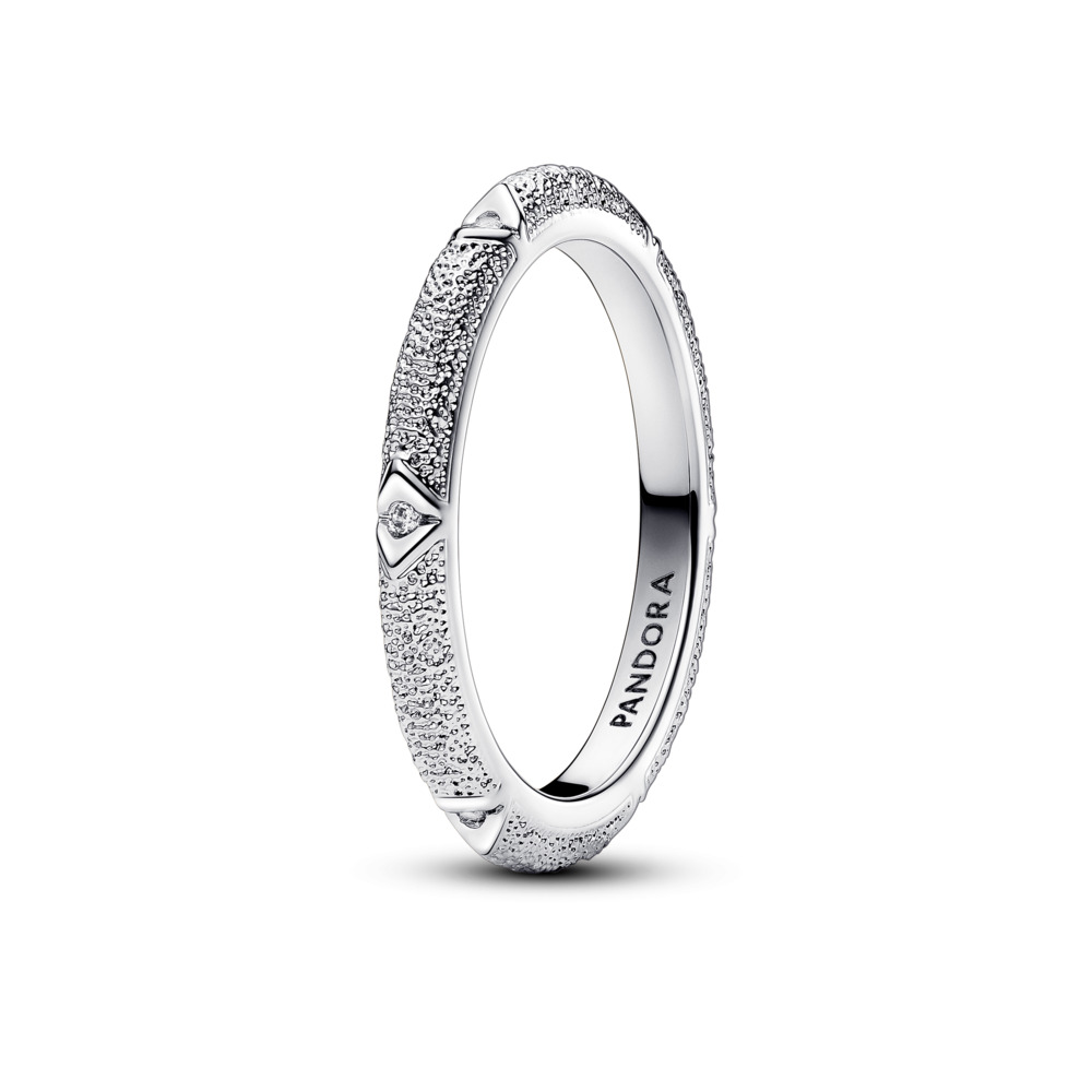 Detaljerna gör helheten med Pandora ME-ringen med struktur och stenar. En ringskena i sterlingsilver med en D-formad profil pryds av sex triangulära punkter, var och en med en sten som glittrar inifrån den lilla springan. Resten av ringens band är utsmyckat med ett strukturerat mönster. Den här utsökta och detaljrika ringen är inspirerad av sandens sken och mönstret av glittrande sol på havet – ett diskret sätt att göra ett statement.