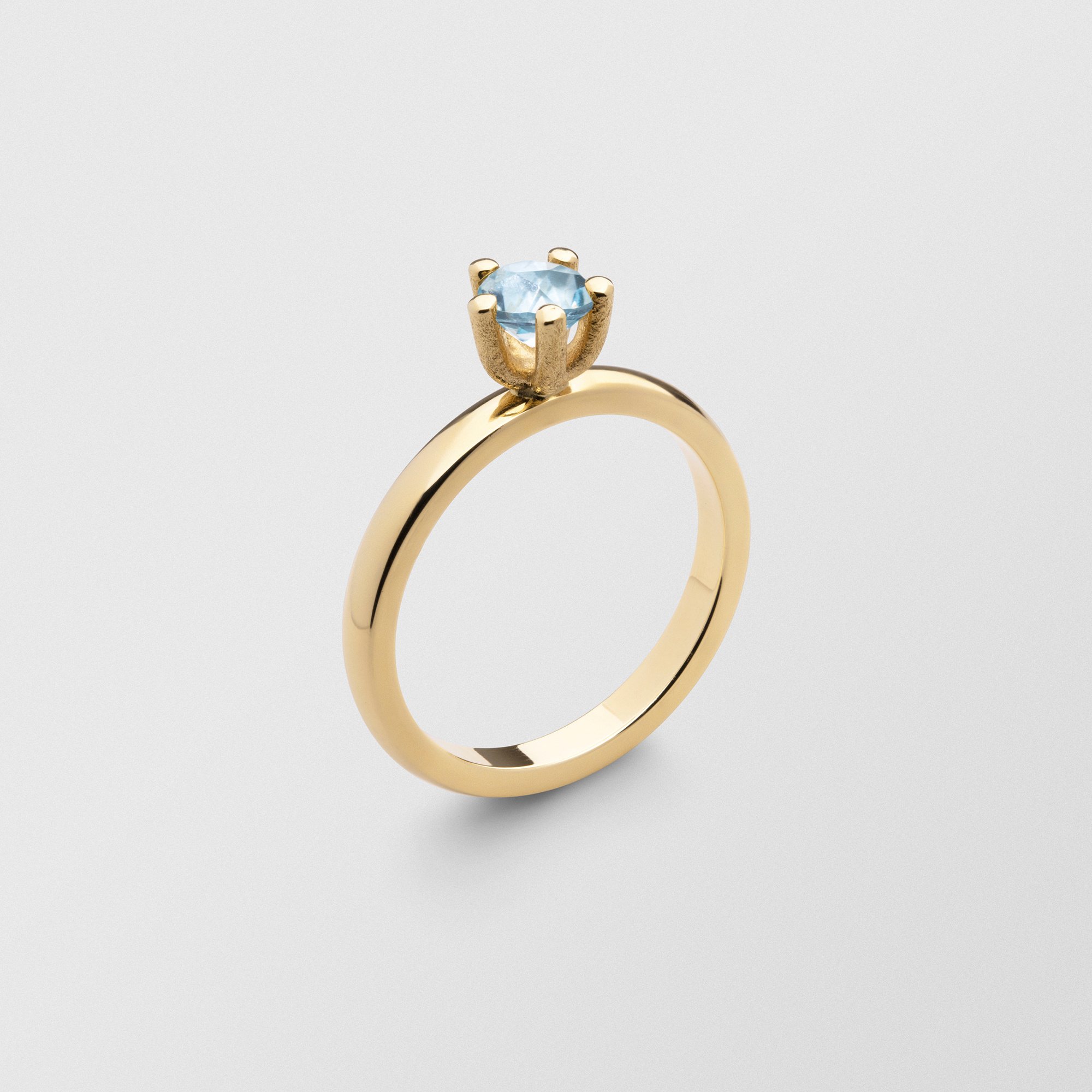 Cocktail kännetecknas av gnistrande stenar i klofattningar och möten mellan matta och blanka ytor. Ringen har en mjuk klassisk form och blank yta. Den elegant slipade stenen vilar i en matterad fattning med blanka toppar. Ringen finns i tre stenstorlekar, denna är den minsta. Du kan bära en eller flera och varför inte tillsammans med ett par matchande Cocktail örhängen. Denna är med Blå Topaz.