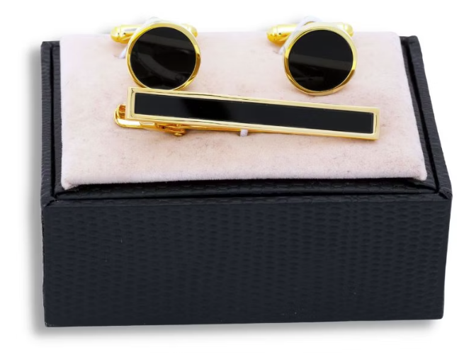 Runda guldfärgade PVD-pläterade manschettknappar i mässing med svart bricka i mitten med matchande slipsnål. Setet kommer med en snygg liten ask att förvara accessoarerna i när de inte används.