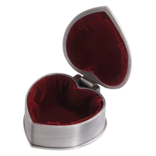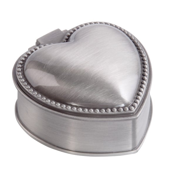 Elegant smyckeskrin med hjärta och pärlkant, i tennfinish. Perfekt som t.ex. doppresent, namngivningsgåva eller baby shower-present.