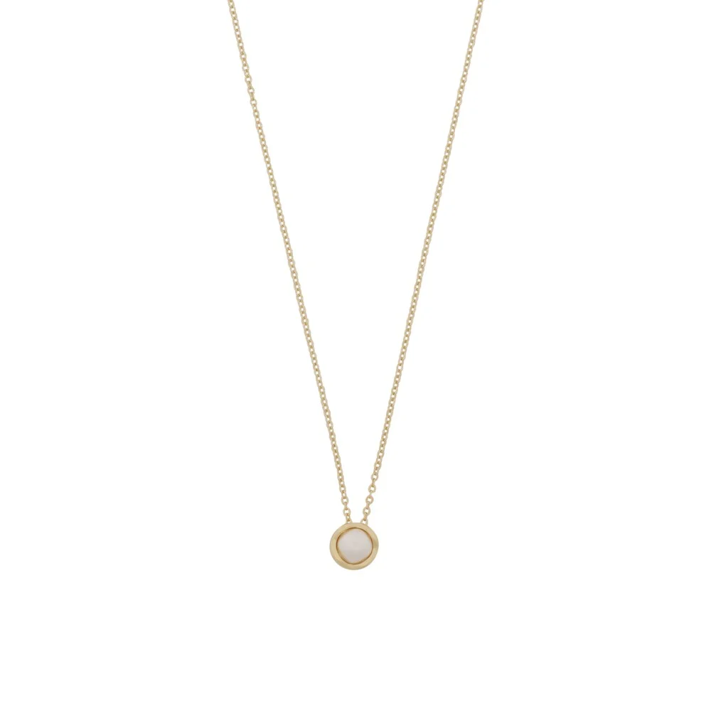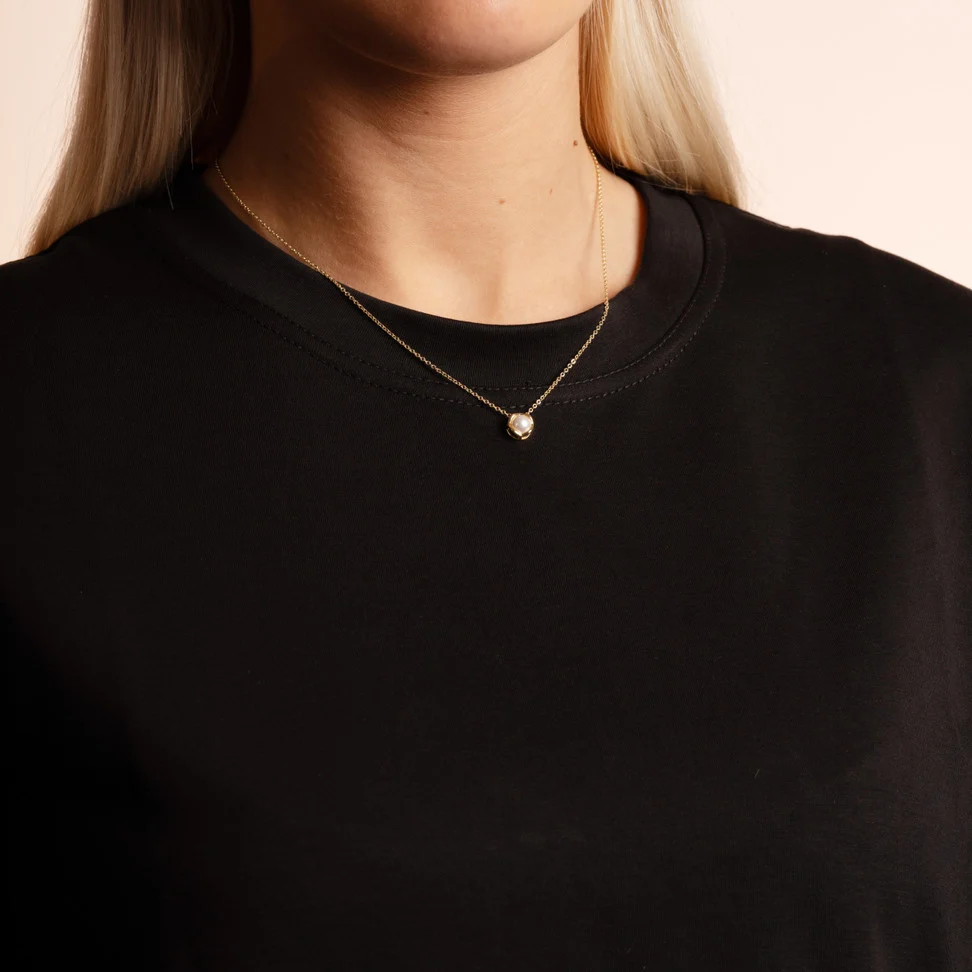 Halsband med tunn kedja och ett runt hänge med en infattad pärla. Hängets ram har en lätt textur som skapar fin kontrast mot pärlan.