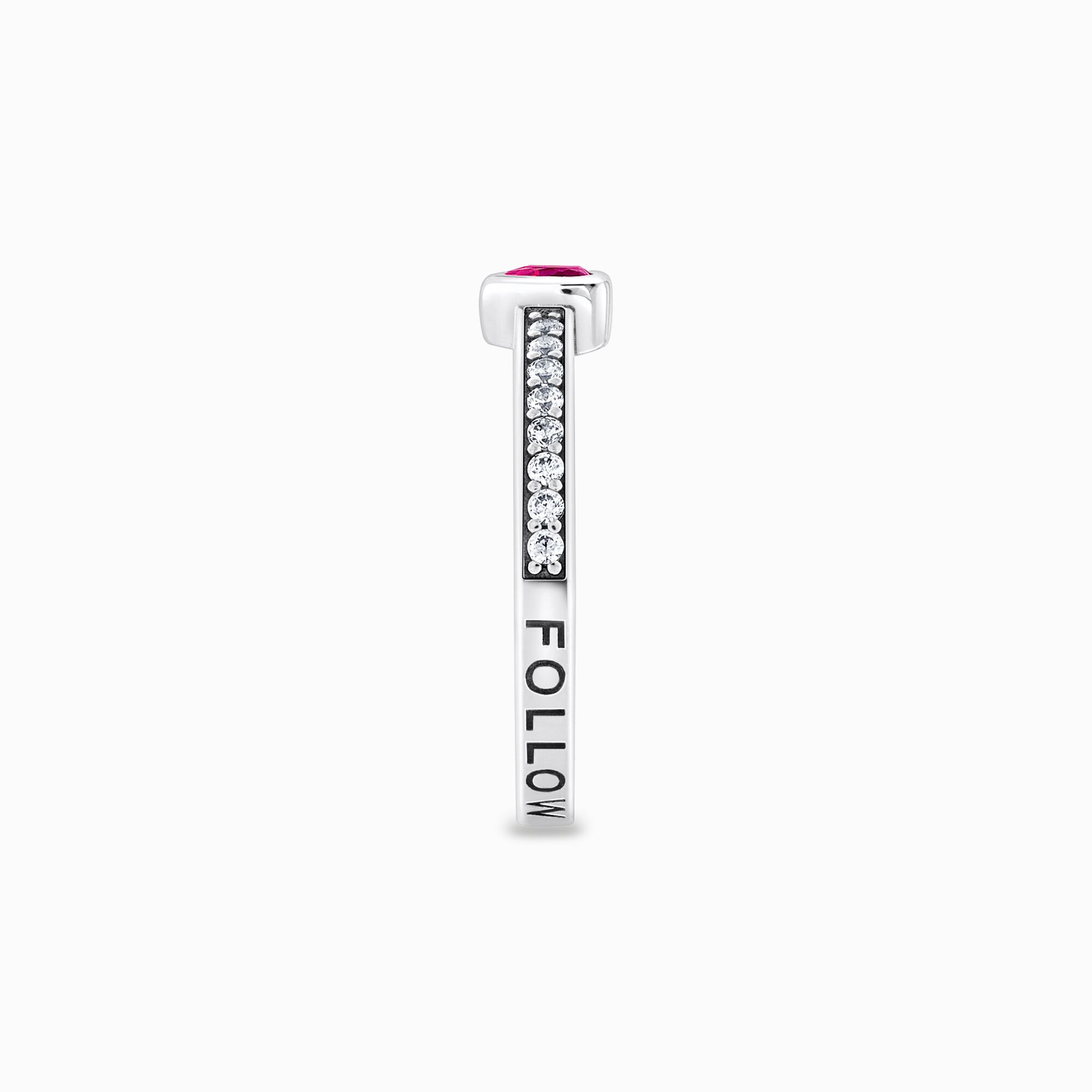 Ringen är tillverkad av återvunnet, lätt svärtat silver och pryds till hälften av vita handplacerade zirkoniastenar. Undersidan av ringskenan är graverad med FOLLOW YOUR HEART.