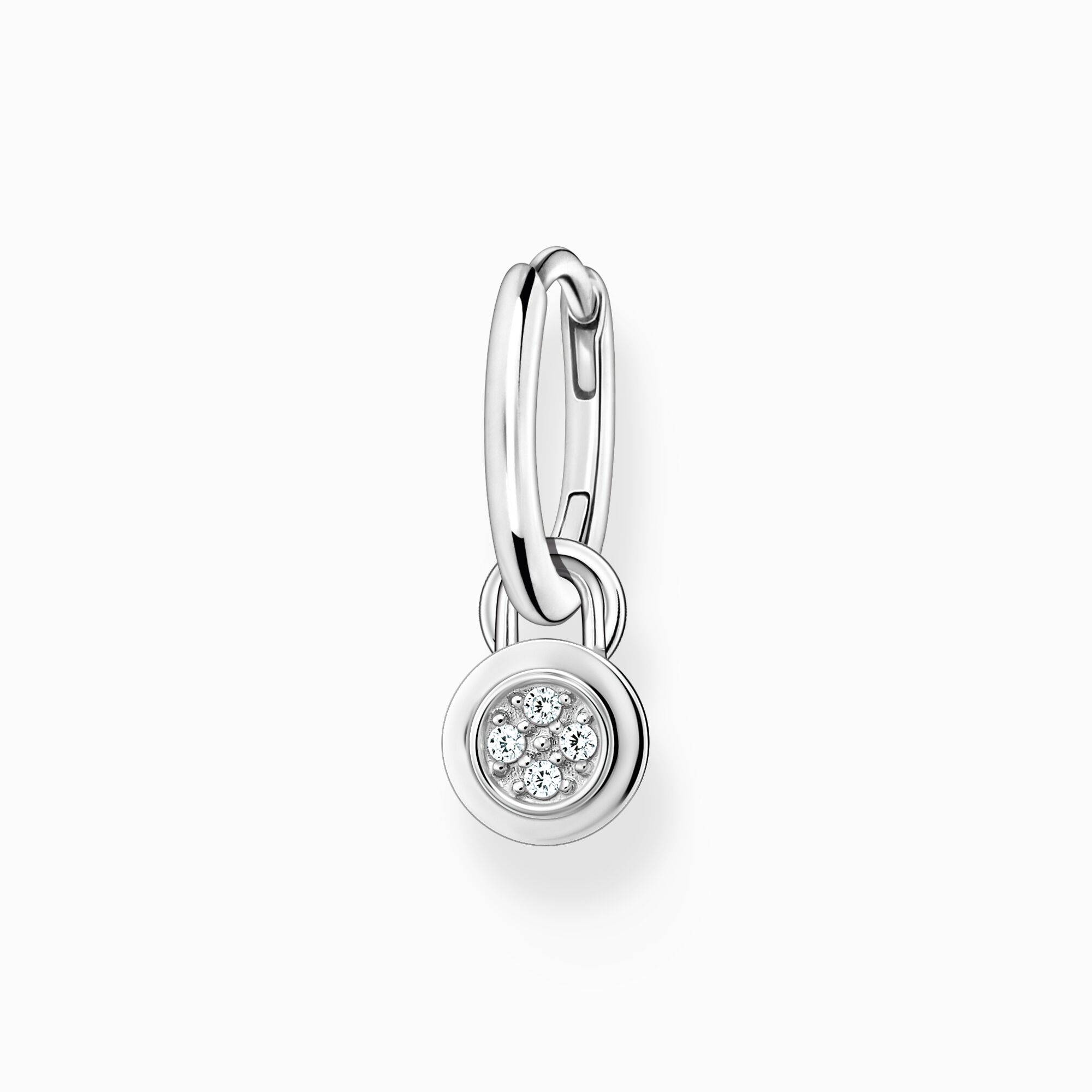 Singel-creolen är av högkvalitativt 925 sterlingsilver och passar perfekt för att skapa en egen smyckeslook. Den är försedd med en ögla, för att hänga en valfri charm i. Charmens karbinhake döljs av ett litet hänge, som är prytt med vita zirkoniastenar. Det gör att det är bara själva charmen som blir synlig i örat.
